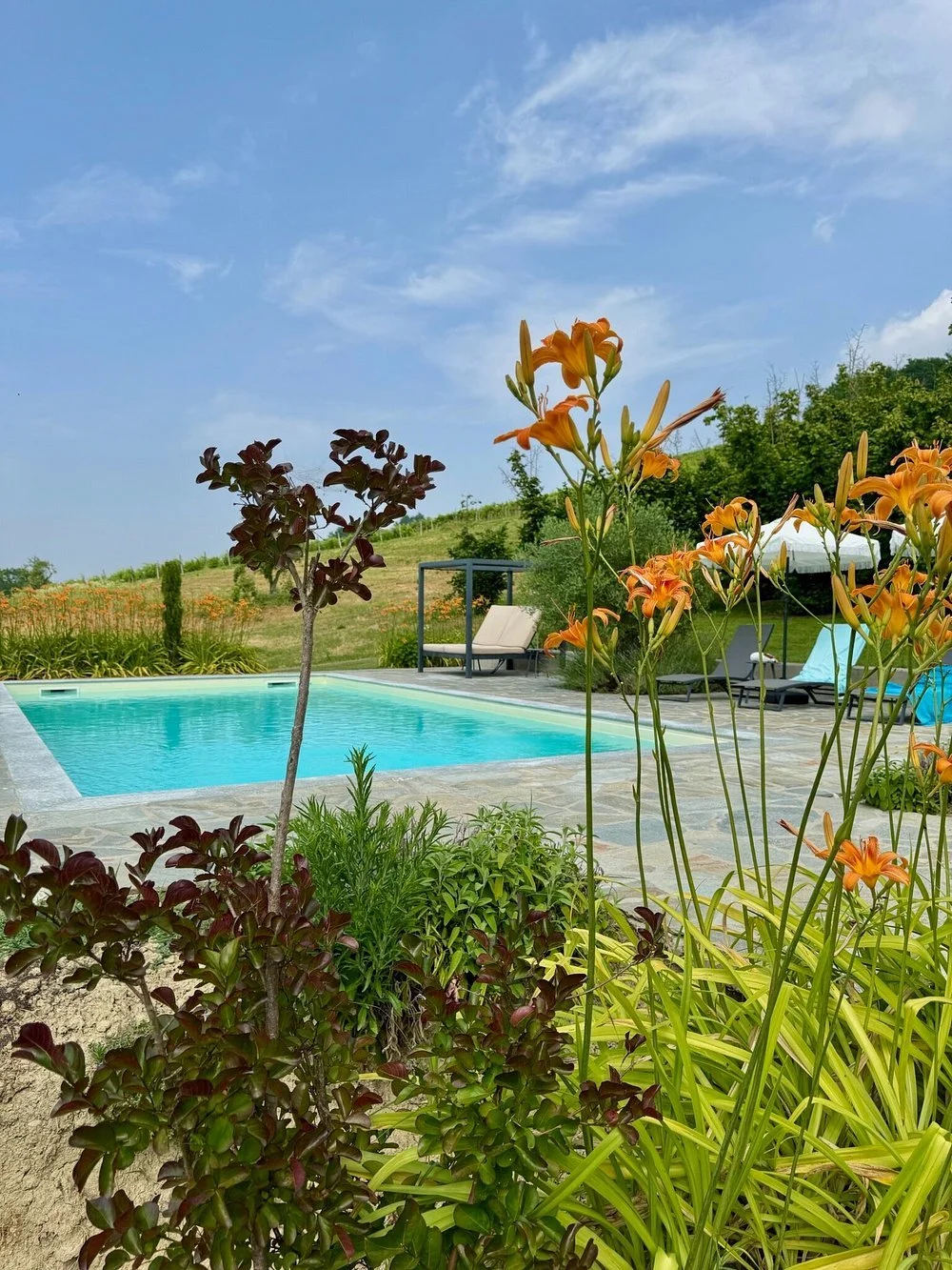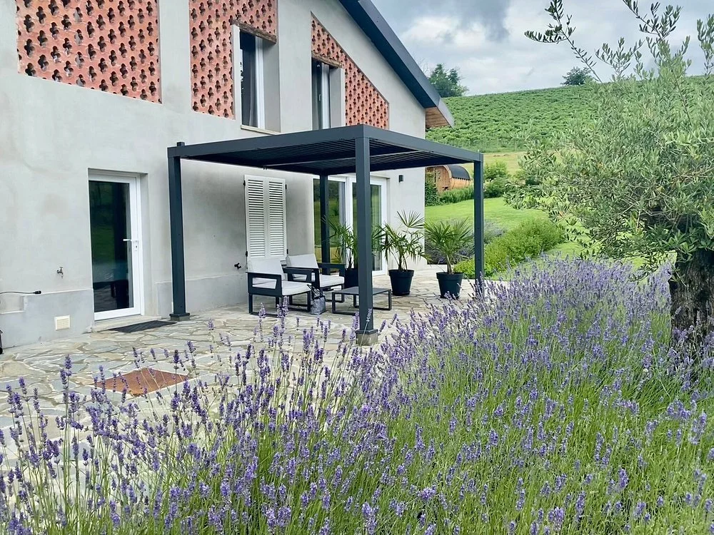 Outside, a beautiful pool area awaits, with a saltwater pool, and sun loungers overlooking the vineyards. We also offer a sauna, a hot tub, and informal pizza evenings in the old barn. This is an Adults Only retreat (20+).